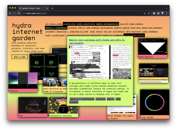 browser-based, hydraever-growing community database of resources, projects, tutorials, and code related to hydra video synth